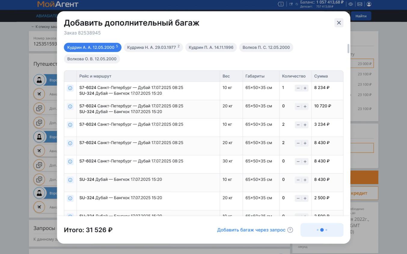 Реализовали в сервисе «Авиа» возможность покупки дополнительного багажа в ЛК. Услуга доступна для заказов в статусе "Выписано", оплатить её можно только с баланса